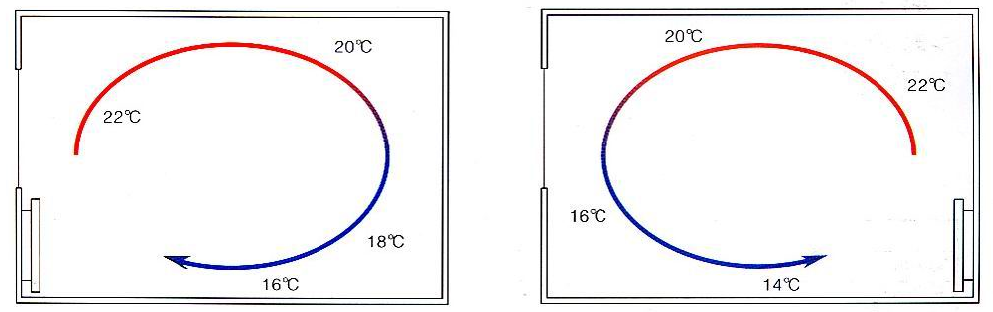 安裝位置的選擇:最佳的安裝位置為窗戶底部或者冷墻壁上(見圖3-1)。雖然這樣做會增加房間的熱量損失,但是這樣能夠使熱量在室內的分布更加均勻,使室內更加舒適(散熱器安裝位置對室內溫度分布的影響見圖3-2)。