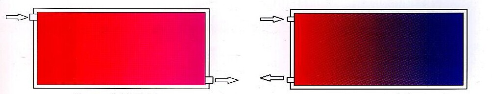 連接方法的選擇:散熱器的進、出口成對角線時,它的散熱效果最佳。當散熱器長度小于1米時,它的進、出口也可以在同側室安裝。(見圖3-3 .3-4)